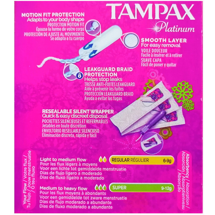 یک راه حل برای کنترل خروج مایع در دوران عادت ماهانه و حرکت راحت تر، استفاده از تامپون است. تامپون تامپکس (Tampax) مدل platinum یک نمونه از انواع این نوع محصول است. تامپون تامپکس در بسته 16 عددی به صورت کاملا بهداشتی عرضه شده است. برای استفاده از آن، یک اپلیکاتور از نوع پلاستیکی عرضه شده که کاربرد آسان و راحتی نیز دارد. تامپونها به دو صورت استفاده میشوند؛ یک نوع آن نیازمند اپلیکاتور برای ورود است و نوع دیگر با دست و به صورت انگشتی وارد میشود. معمولا جنس تامپونها از پنبه و نرم است. برای بیرون کشیدن تامپون، نخی در انتهای آن تعبیه شده که با کشیدن آن، تامپون خارج میشود. یکی از مهم ترین نکات در استفاده از تامپون، استفاده نکردن از آن در طول شب است چرا که میتواند خطرساز باشد. این تامپونها در بسته بندی جداگانه برای رعایت بهداشت بیشتر قرار دارند که این بسته به راحتی قابل حمل است.