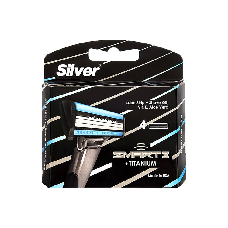 خودتراش اسمارت یکی از محصولات خوب برند «Silver» (سیلور) برای آقایان است. برای تعوض سری و استفادهی بیشتر از این خودتراش، برند سیلور تیغ یدک با همان مدل «Smart3» را عرضه کرده است. یدک اسمارت 3 در بستهی 4 عددی ارائه شده که امکان استفادهی چند باره از آن را فراهم ساخته است. این یدک دارای 3 تیغه از جنس تیتانیوم است که در بالای آن نوار ژل حاوی عصارهی آلوئه ورا و ویتامین E قرار دارد. این نوار ژل غنی شده، تاثیر بسیار خوبی در جلوگیری از ایجاد حساسیت و التهاب پس از اصلاح دارد. همچنین حرکت تیغ را بر پوست روان و بی خطر میسازد. وجود محافظ میکرو ماتریکس، از بریدگی پوست جلوگیری میکند. این یدک بسیار مناسب برای استفادهی افرادی با پوست حساس است. برند سیلور سعی بر آن داشته تا با در نظر گرفتن سلامت پوست و ظاهر آقایان و خانمها، خودتراشهایی با کیفیت و کارایی مطلوب، مطابق با تکنولوژی روز تولید کند. این برند به غیر از رعایت کیفیت در ساخت، به نوع و شکل بسته بندی محصولاتاش نیز توجه ویژهای کرده است. خرید این بسته کمک میکند تا از خودتراش خود، بیشترین استفاده را ببرید.
