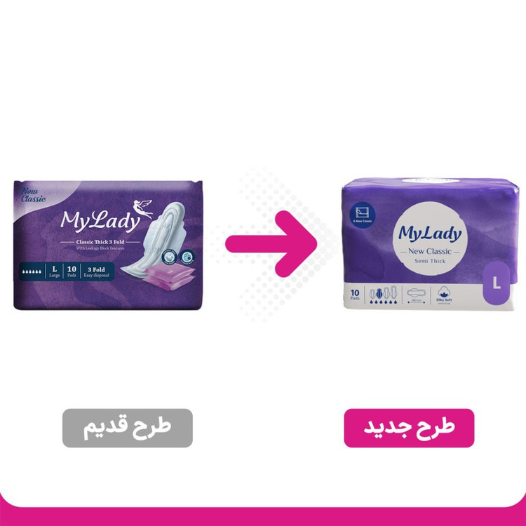 نوار بهداشتی نیو کلاسیک مای لیدی با بسته بندی بنفش دارای لایه رویی با حس نرم پنبه ای بوده و مناسب پوست های حساس می باشد. این نوار بهداشتی سه تا شده است که از هرگونه نشتی جلوگیری میکند.همچنین برای استفاده و حمل راحت تر هر کدام از نوار ها در یک بسته بندی جداگانه قرار داده شده است.این محصول در بسته ده تایی عرضه می شود.