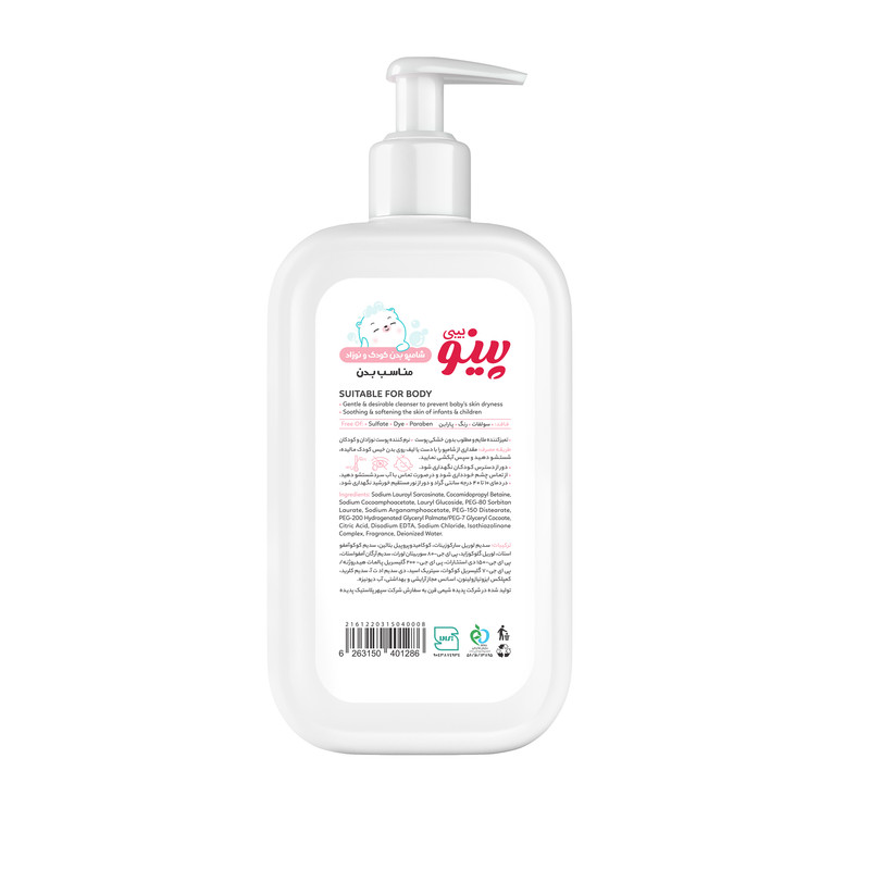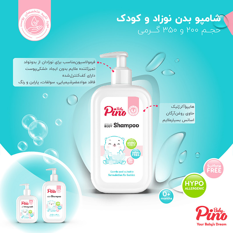 شامپو بدن نوزاد و کودک پینو بیبی بسیار ملایم و مناسب برای نوزادان (از بدو تولد) و کودکان طراحی شده است. جهت جلوگیری از ایجاد هر گونه حساسیت و آسیب، ترکیبات محصول کاملا مطابق با پوست حساس نوزادان انتخاب و فرموله شده است. تمیزکنندگی ملایم شامپوها بدون ایجاد عارضهی خشکی، حفظ لطافت و نرمی پوست را تضمین میکند. میزان کافی و اثرگذار روغن آرگان موجود در این محصول سبب ایجاد ویژگیهایی مثل آبرسانی و جلوگیری از ایجاد خشکی در اثر شستشو شده و در مجموع سبب تقویت و حفظ سلامت ساختار پوست کودک میشود. تمامی شامپوهای پینو بیبی با توجه به حساسیت پوست نوزادان تازه متولد شده و کودکان، فاقد مواد مضر شیمیایی مثل سولفات، پارابن و رنگ بوده و همچنین هنگام شستشو سبب ایجاد حساسیت نمیشوند. در ساختار فرمولاسیون شامپوها از اسانسهایی کاملا هایپوآلرژنیک با رایحهای ملایم و دلپذیر استفاده شده که در کنار تمیزکنندگی مطلوبی که دارند، طراوت و شادابی را به پوست نوزاد و کودک میبخشند.